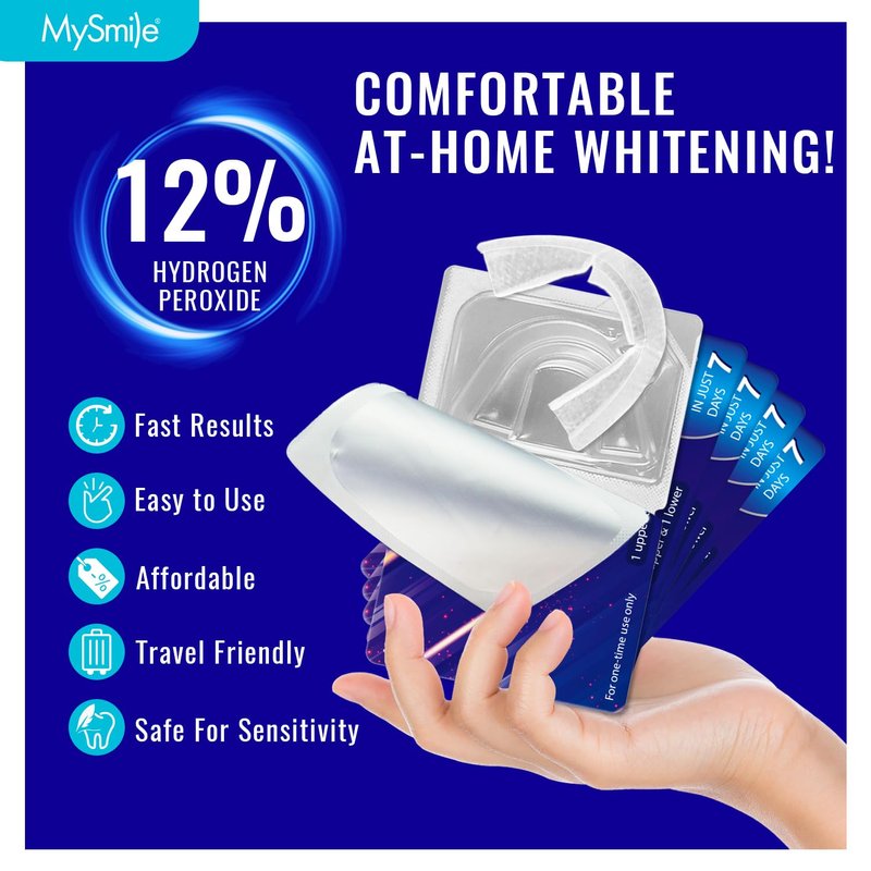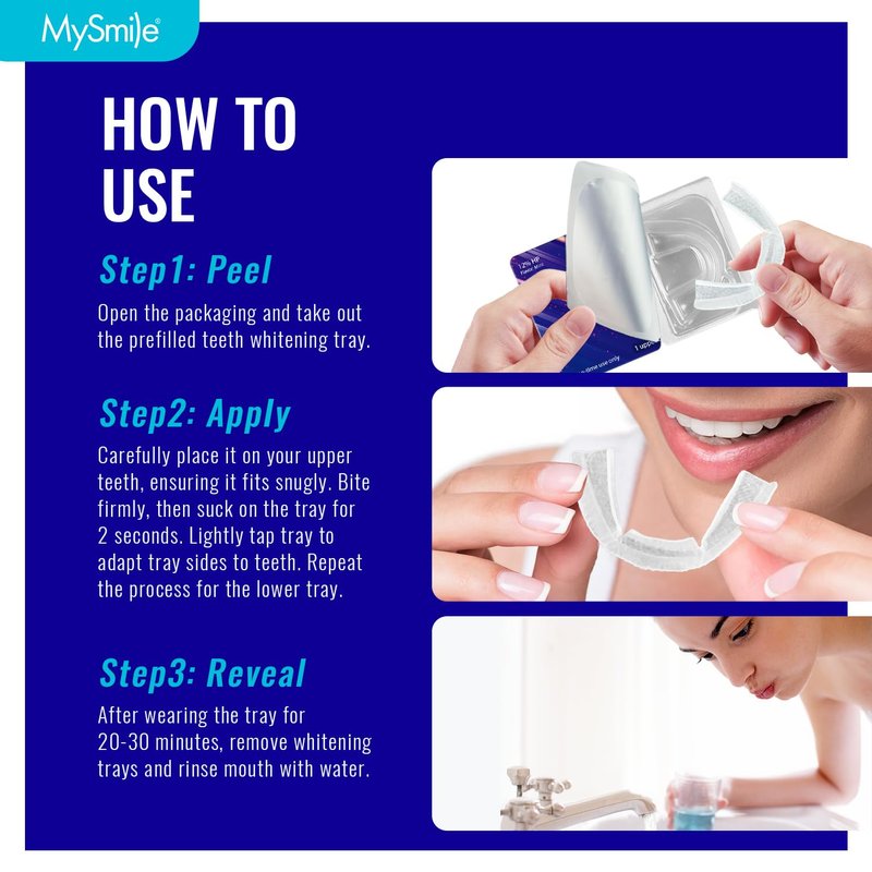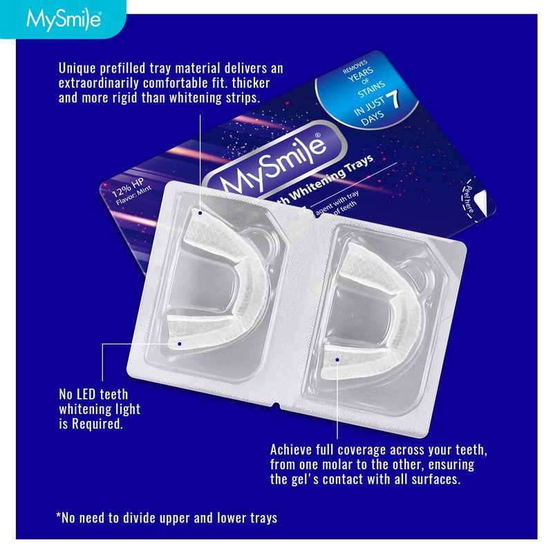 - WORKS ON DISCOLORED TEETH & EASY APPLICATION-MySmile teeth whitening gels are gluten-free, kosher, and sweetened with Xylitol reduces the risk of tooth decay while mint flavor facilitates freshen breath; Just peel the case, then apply 1 treatment of whitening tray to upper and lower teeth, ultimately rinse with water and enjoy your shiny and fresher smile
