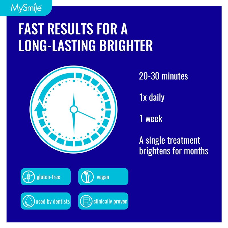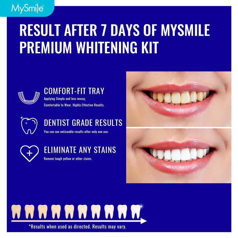 - INSTANT TEETH WHITENING RESULTS-BPA-free Teeth Whitening Trays deliver quick, noticeable results in just 20-30 minutes a day. In just 7 days, you can brighten your smile by up to 7 shades; Our advanced formula is designed to keep your teeth looking their best for the long haul, effectively removing stains from coffee, smoking, soda, wine, tea, and more. Get a brighter, whiter smile that lasts long with MySmile!