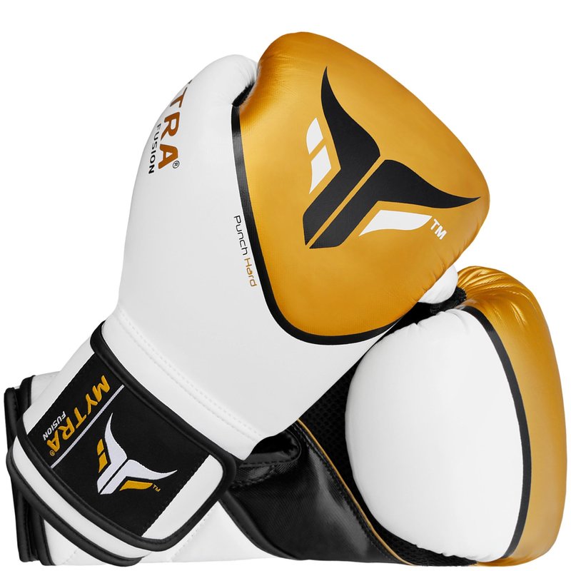 Mytra Fusion Punch Hard Boxing Gloves Artificial Leather Boxing Gloves 10oz 12oz 14oz 16oz Boxing Gloves for Training Punching Sparring Punching Bag Muay Thai Kickbox (14-oz, White Gold)