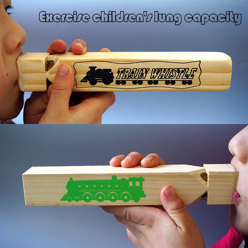 - Funny Train Whistles: You get 2 wooden train whistles with a soft 4 tone. The wooden whistle would make a long beeping sound, like a distant train whistling past. Great for building up children's lung capacity and for all kinds of party noise makers.