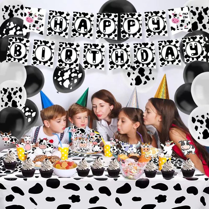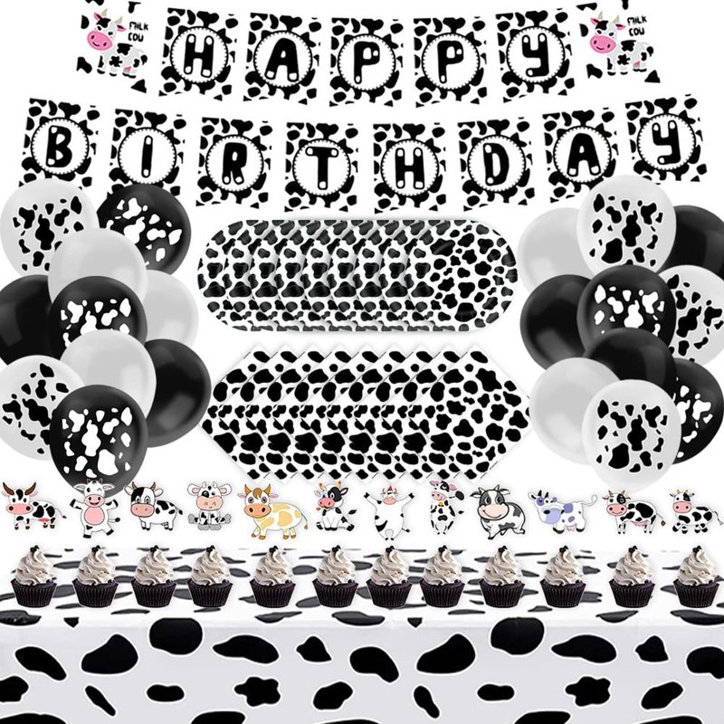 - Cow Print Birthday Party Supplies - Look No Further! Our complete cow party supplies will add joy to your family and friends. Include unique happy birthday banner, 20pcs cow print plates, 20pcs napkins, 12pcs latex balloons, 1pcs large table cover, 12pcs cute cow cupcake toppers, include everything you need to throw a funny cow party!