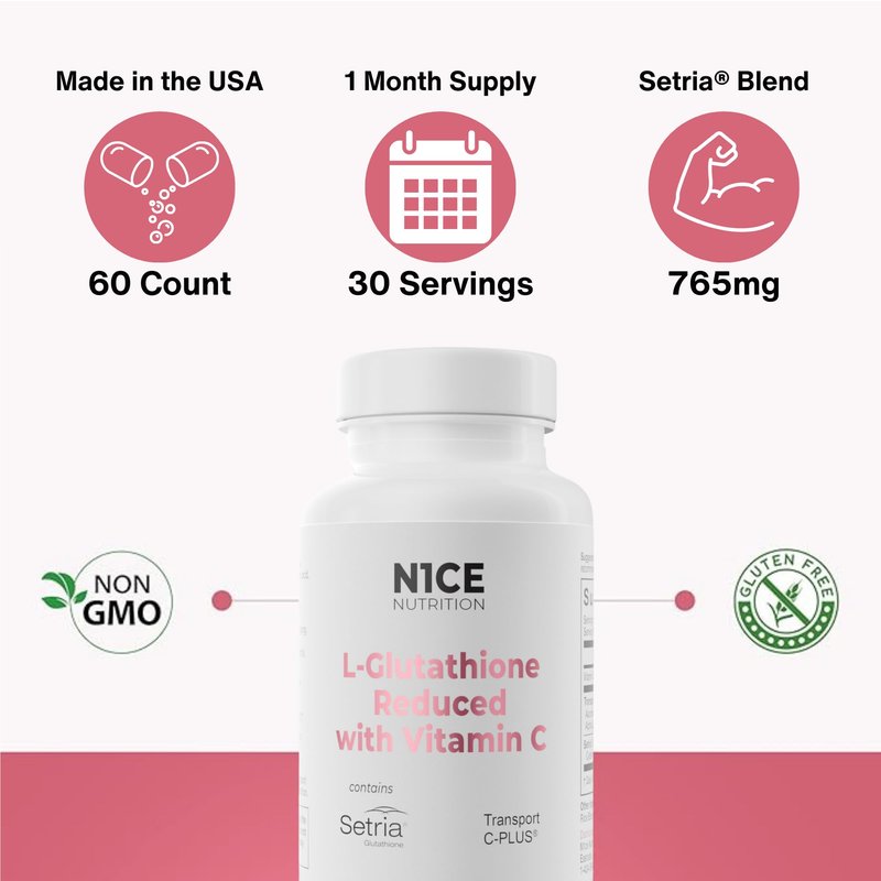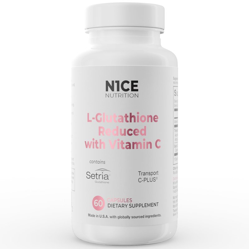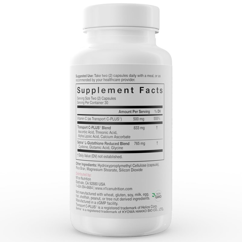 L-Glutathione Reduced with Vitamin C combines only the most advanced ingredients to maintain proper cellular function, boost immune health, and help with the aging process.* It is formulated with Setria Glutathione, a pure, vegetarian, and allergen-free glutathione that supplements blood glutathione levels, which is essential for optimal health.* Classified as a superior form of glutathione, Setria Glutathione fights free radicals, helps eliminates toxins naturally, and replenishes the body’s reserves.* N1CE Nutrition’s, L-Glutathione Reduced with Vitamin C is also a Vitamin C powerhouse! It is packed with Transport-C Plus, a high-strength, highly-bioavailable, studied formulation that increases the human bioavailability of vitamin C three times more compared to ascorbic acid alone.* Vitamin C plays many essential roles and is crucial for skin health, immunity, iron absorption, and more.* N1ce Nutrition, Setria L-Glutathione Reduced is a tripeptide consisting of three amino acids: glutamic acid, cysteine, and glycine. Clinically studied to increase glutathione levels and support the immune system.* Setria Glutathione supports skin health, promotes healthy aging, and overall health.* Setria Glutathione supports healthy liver by eliminating harmful toxins.* N1ce Nutrition, Transport C-PLUS represents the Next Generation of Vitamin C formulation. Superior bioavailability* Buffered (non-acid) Calcium Ascorbate Vitamin C.* *These statements have not been evaluated by the Food and Drug Administration. This product is not intended to diagnose, treat, cure, or prevent any disease.