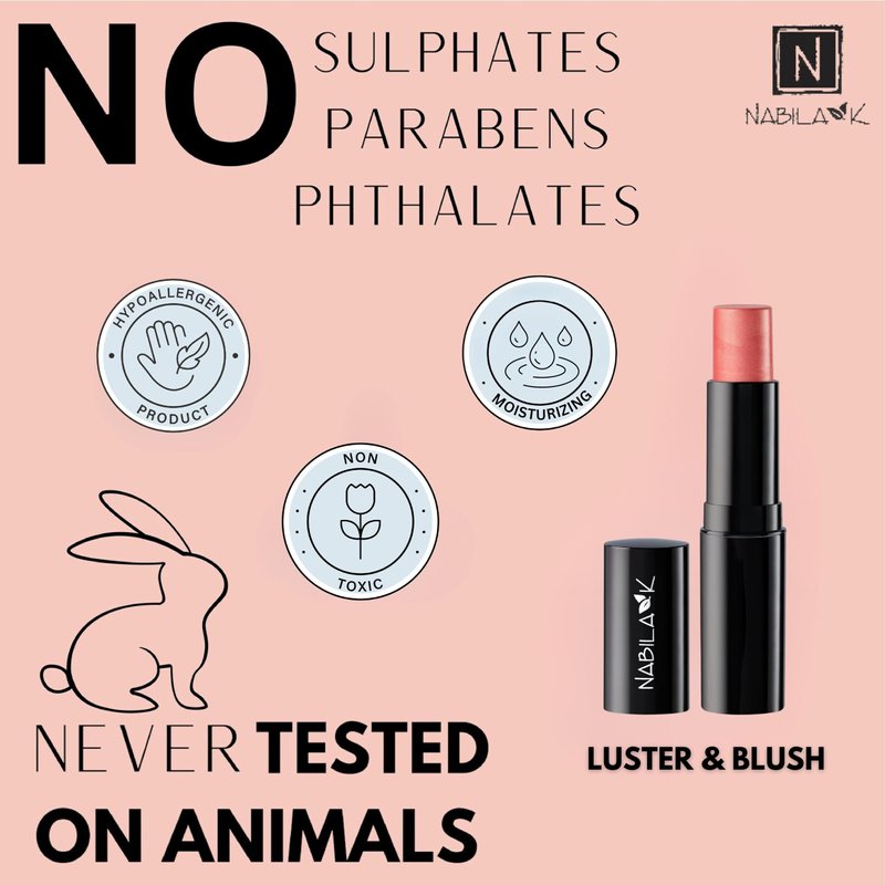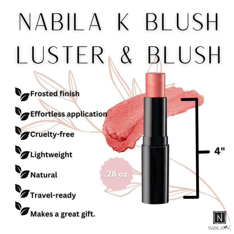 - With a single swipe, Nabila K’s Luster & Blush adds a gorgeous glimmer to your cheeks. The warm color lights up and brightens your cheeks, all while enhancing your skin thanks to the vitamin E enriched ingredients. One application of the beauty stick easily lasts the entire day.