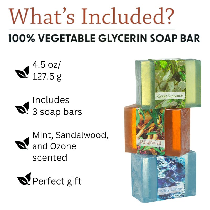 - Made from 100% vegetable glycerin, this vegan-friendly natural glycerin soap lets you lather yourself, leaving your skin feeling smooth and moisturized, without leaving behind a film of guilt. As a cruelty free soap, no animal products or byproducts are used in any part of this soap's production. This 3 bar set includes the following soaps: Green Essence, Royal Wood, and White Horses.