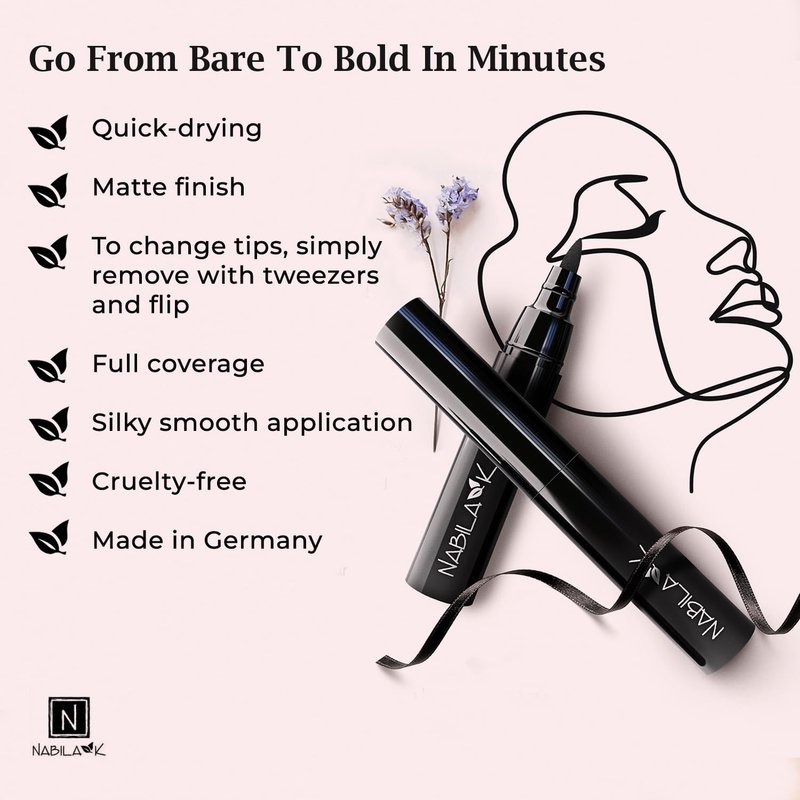 Cat eye? Check. Wings with attitude? Check. Eyeliner that goes all day like you do? Double check. Inkjet eyeliner by Nabila K allows you to go from bare to bold in minutes. Goes on evenly, like silk. Dries quickly. Matte finish allows you to use it for full coverage for a no-holds-barred look. Eyeliner is cruelty-free, ethically sourced, comes with reusable tips and is ready to be a part of your clean beauty lineup. As always, NK products are sustainably sourced, cruelty-free, and ready to be a part of your clean beauty routine. Directions: Apply in a smooth stroke with even pressure to create an incredible look. Beauty Bonus: To revive and keep the felt tip fresh: Pull out the tip of the eyeliner using a tweezer. Rotate and insert the tip back into the pen cartridge so the fresh side is exposed. Always secure the cap after every use.