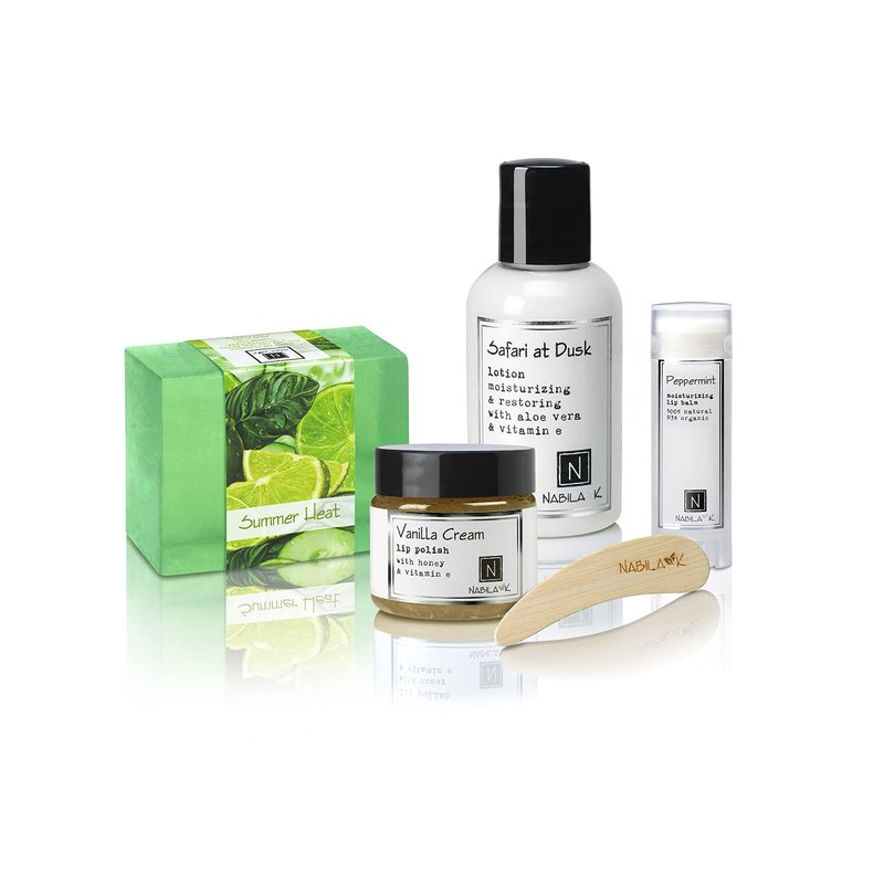 - Each product included in this gifting box has been carefully selected to be used together. Our Summer Heat Glycerin Bar Soap gently cleanses and soothes hot, sticky skin. Vanilla Cream Lip Polish gently buffs away dead skin from sensitive lips. Safari at Dusk Body Lotion hydrates your skin while anointing it with the delicate scent of Persian spices. Peppermint Lip Balm hydrates and protects sensitive lips.
