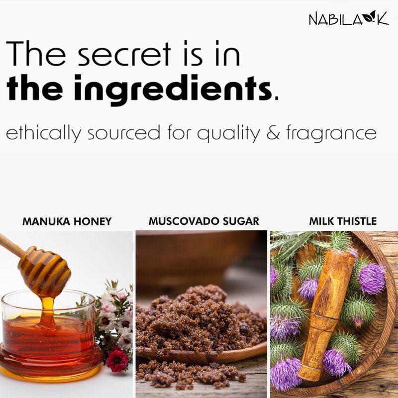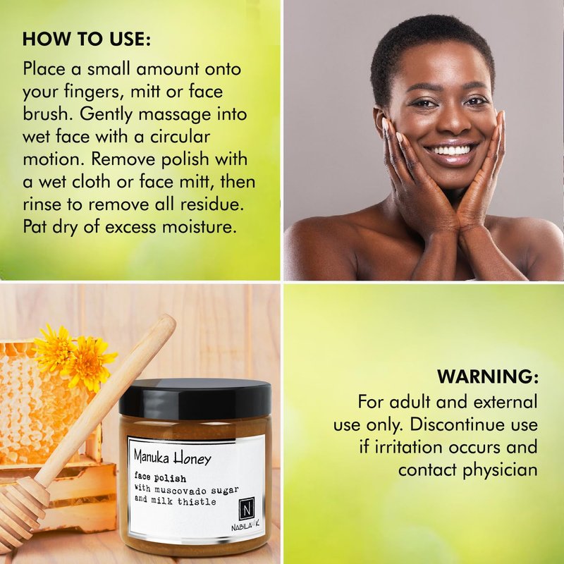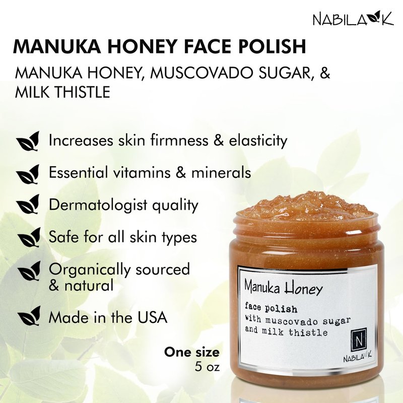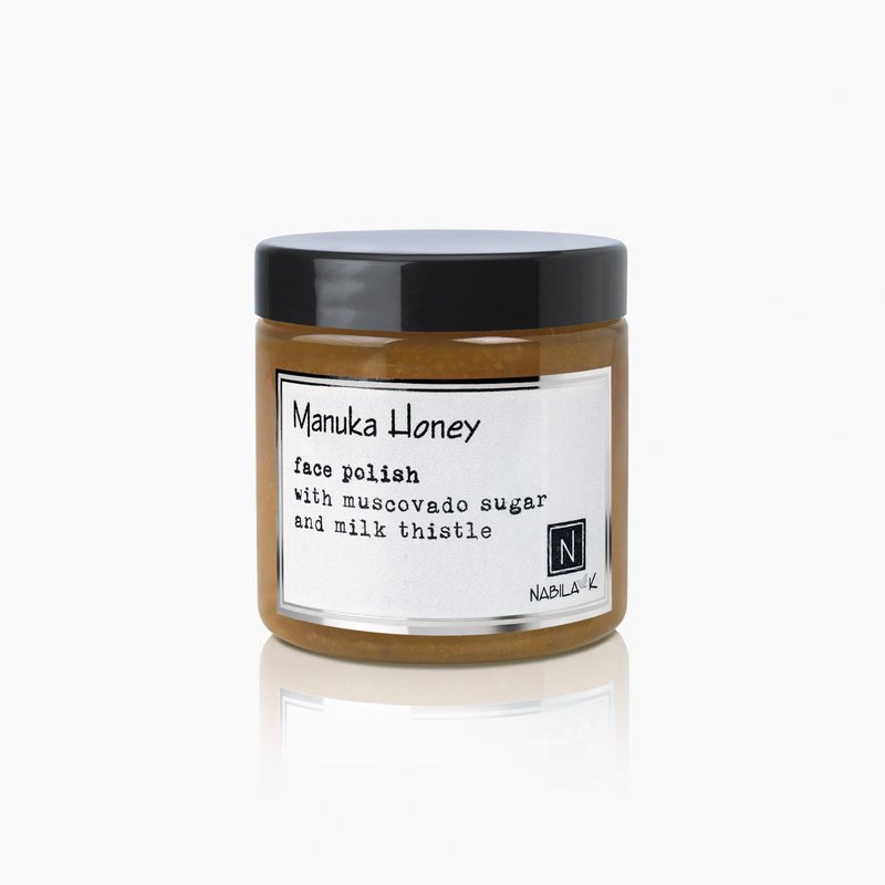 Deeply cleansing, extraordinarily nourishing Manuka Honey face polish by Nabila K leaves your face glowing and hydrated. Ultra-moisturizing facial scrub combines muscovado sugar with milk thistle to leave skin luminous and glowing. Washes clean. Leaves a subtle honey-kissed scent on your skin.