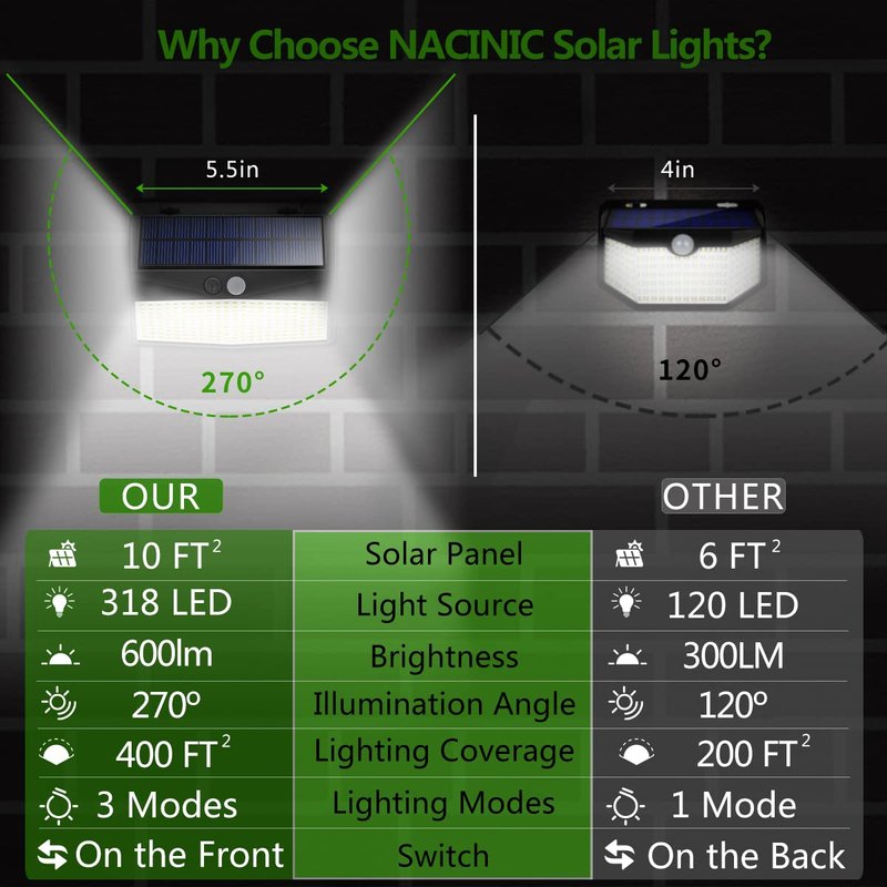 - Solar Powered Outdoor LED Lights: NACINIC solar wall lights with high efficient solar panel, can convert up to 22.5% of sunlight to electricity. Equipped with large capacity battery and 318 LED, it can provide bright solar illumination. You don't have to pay more on electric bill, money saving.