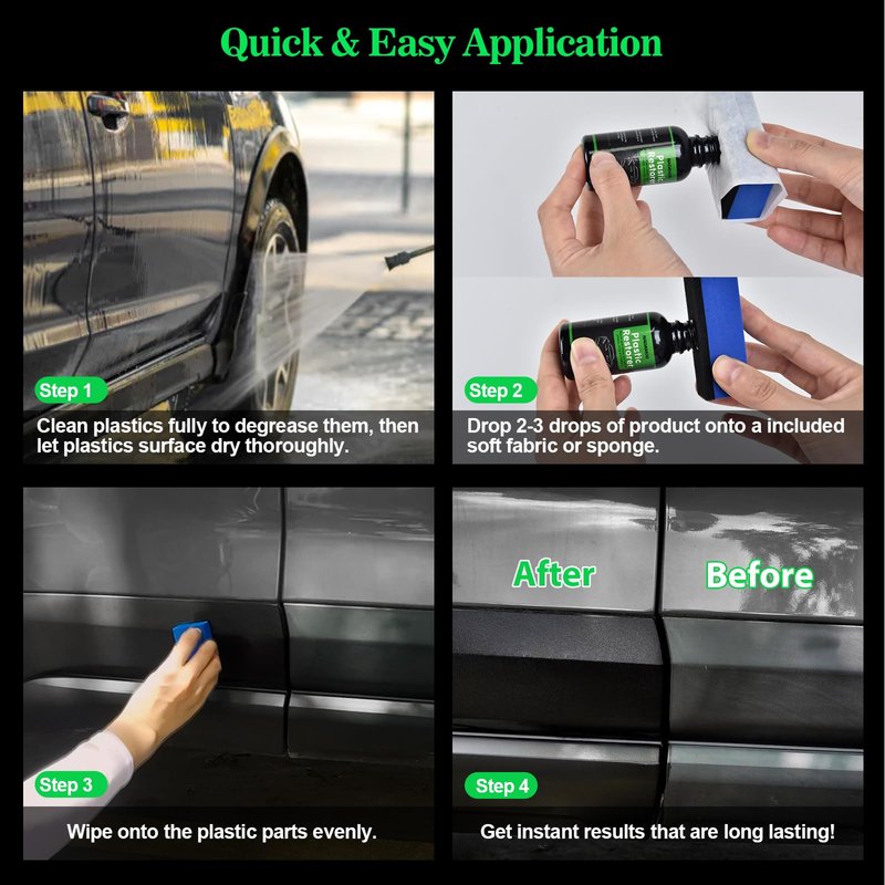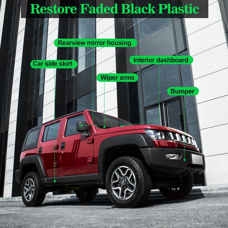 - 【Wide Application】Our Plastic Restorer can be used to restores, conditions, renews, and protects nearly any black plastic on your vehicle, including black bumpers, mirrors, window trim, handles, dashboards, door panels, and more.