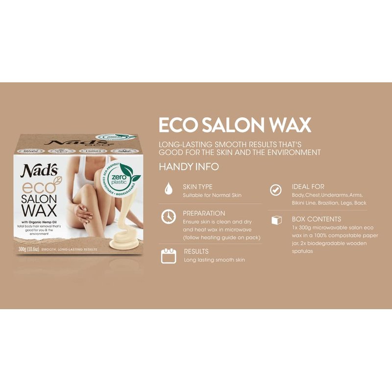 - Nad's Eco Salon hard wax kit is plastic free, compostable, biodegradable tub and wooden spatula, 100% recyclable packaging and vegan formula.