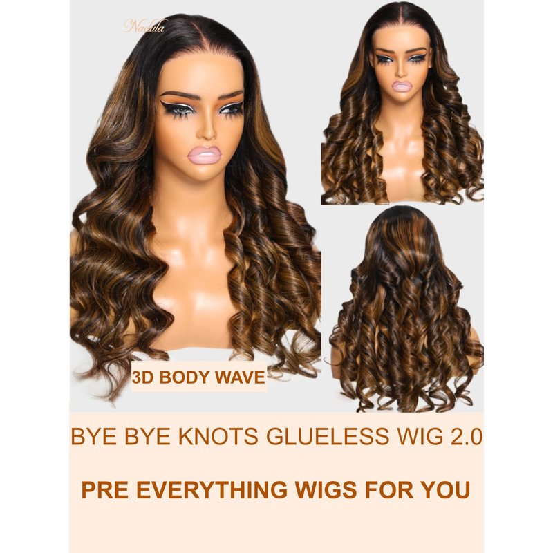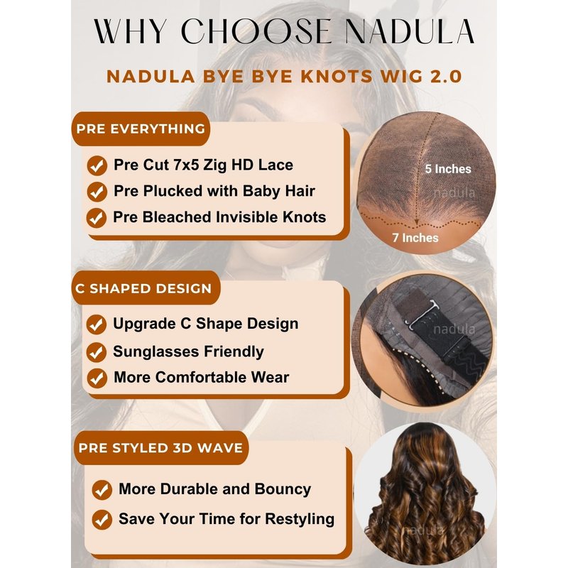- 【Why Nadula 7x5 Bye Bye Knots Glueless Wig】:Really Pre Everything Wig for you,Upgrade 7x5 HD Balayage Brown Highlight Colored Body Wave Bye Bye Knots Wig,Pre bleached/Cut/Plucked,Bleacked,Deep side part and 3D Dome cap free Install, promises versatile styling choices.No Skills Needed, Beginner-Friendly.