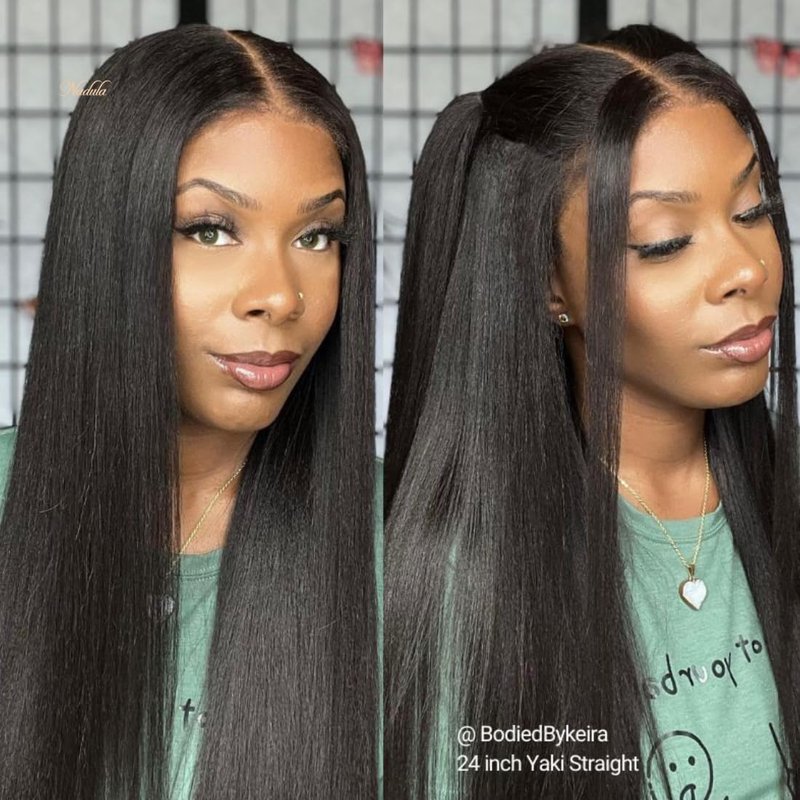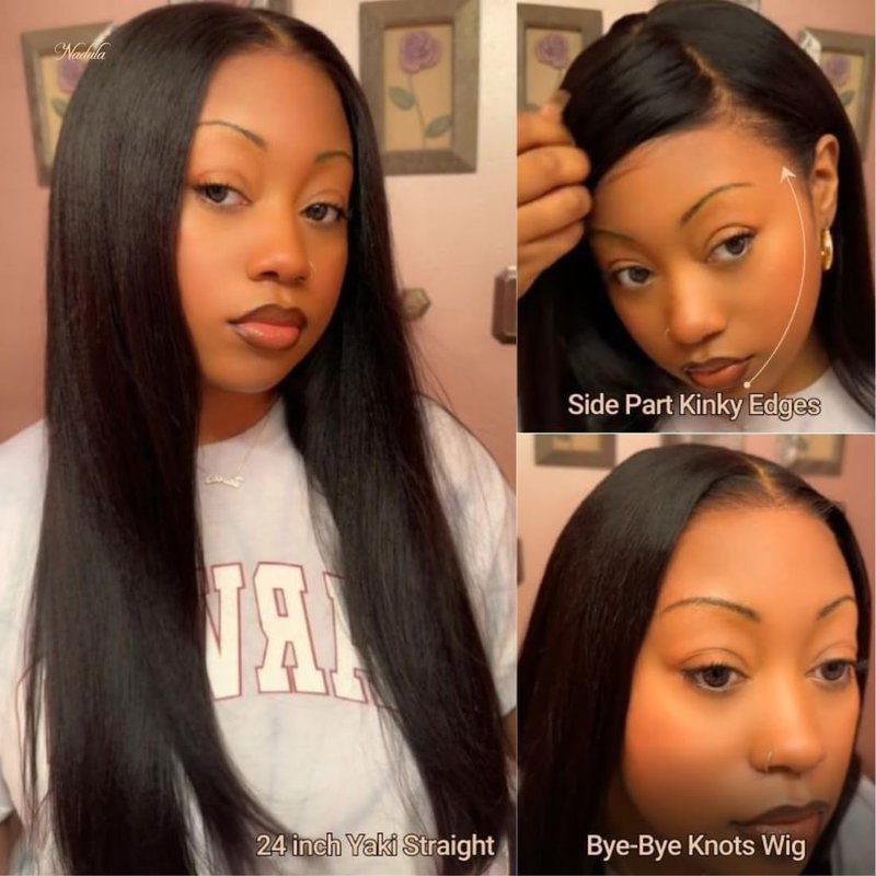- 【Bye Bye Knots Yaki Straight Glueless Wig】:Nadula Bye Bye Knots Glueless Yaki Straight Invisible Knots Wigs With Kinky Edges Hairline,Easy and 0 Skill Installed,Glueless Pre Everything Wig,Pre Cut ,Pre Plucked and Pre C Shaped Design.
