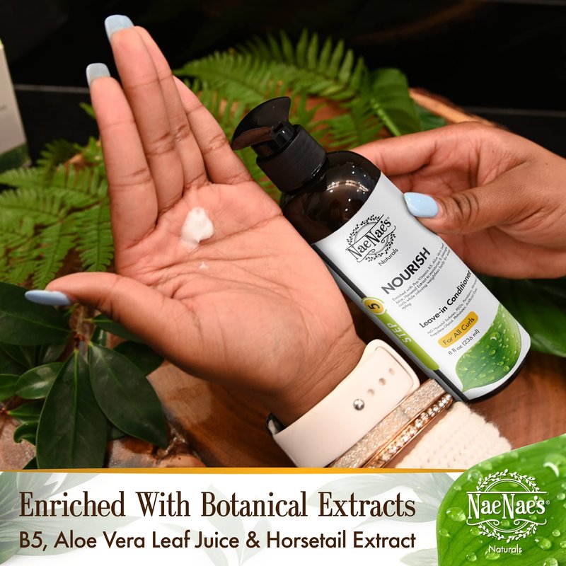 Protected Hair & Healthy Scalp With Step 5: Excellent work getting your hair deeply cleansed, purified, and boosted. It’s ready for our sumptuous Nourish Leave-In Conditioner. Step 5 in your careful process is bursting with botanical extracts specially selected for the ultimate in moisturizing, detangling support. Nurture & Nourish For Deep Healing: A gentle salve for itchy scalps, dandruff, and psoriasis, Nourish is formulated to ease these issues while simultaneously strengthening strands and promoting healthy growth. A comprehensive blend of natural elements encourages all-over wellness for your skin, follicles, and locks. Glorious, Shiny Results Up Ahead: Your well-deserved indulgent treatment is nearly complete, and the beautiful rewards are sure to stun. Applying Nourish Leave-In Conditioner through your crown is the ultimate treatment for your strands—feel how well it detangles, smooths, moisturizes, and shields your strands. You’re ready for styling your curls, coils, dreads, or other protective styles.. Hydrate & Strengthen Your Hair In Just 7 Steps: We've created a 7-step method to purify, restore, hydrate, repair, and nourish your hair. From our herbal clarifying & moisturizing shampoos to our conditioning hair boost and styling foam lotion, each product works together to help grow and strengthen your strands. Shrink your hair-care collection with our 7-step bundle and streamline your weekly wash days. Real Ingredients Delivering Real Results: A family-owned & operated business, Nae Nae's Naturals started off with homemade recipes to help treat eczema. Since then, we've expanded our collection to include products that heal and nourish your hair & skin. Made with ingredients you know and trust, our products are non-GMO and cruelty-free.