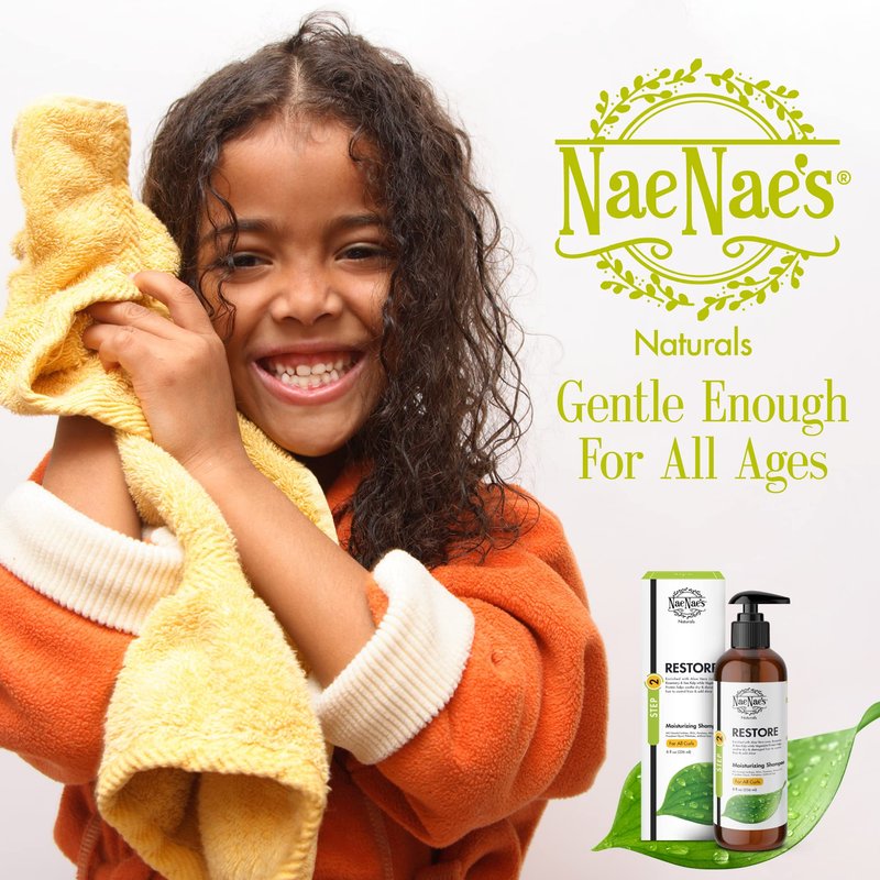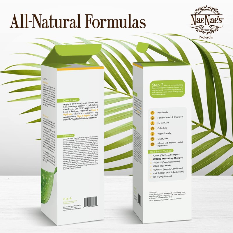 Pamper Hair & Scalp With Step 2: You’ve purified your crown, so now you’re ready to lock in healthy, moisturizing ingredients to restore moisture. Lather up with our Restore Moisturizing Shampoo to indulge in botanical and flower extracts that reduce inflammation and scalp build-up while enhancing strength, shine, and growth. Luxurious Moisture-Boosting Formula: Spa-quality elements abound in Step 2 of our haircare method—enjoy the healing & restorative qualities of Aloe Vera, Apple, Lavender, and Sea Kelp extracts. They’ll take your hair and scalp to a whole new level of strong elasticity and get you readynto move on to the next stages of this invigorating routine. Show Your Hair How Much You Care: Nurturing those delicate strands means taking time to hydrate & fortify your hair, and this is the ideal formula for the unique needs of your gorgeous curls. Bask in the nourishing extracts of Restore and enjoy the hydrating, stimulating effects on your hair and follicles. Hydrate & Strengthen Your Hair In Just 7 Steps: We've created a 7-step method to purify, restore, hydrate, repair, and nourish your hair. From our herbal clarifying & moisturizing shampoos to our conditioning hair boost and styling foam lotion, each product works together to help grow and strengthen your strands. Shrink your hair-care collection with our 7-step bundle and streamline your weekly wash days. Real Ingredients Delivering Real Results: A family-owned & operated business, Nae Nae's Naturals started off with homemade recipes to treat eczema. Since then, we've expanded our collection to include products that heal and nourish your hair & skin. Made with ingredients you know and trust, our products are non-GMO, cruelty-free, and have zero toxins and aluminum.