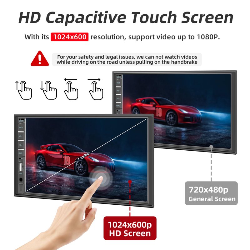 - 👍【Capacitive Touchscreen & Mirror Link】7 inch touchscreen car aduio receivers equipped with high definition capacitive touch screen, supporting 1920*1080P video, enhance your visual experience. You can put the mobile phone apps on the HD display via the mirror link that you could realize control between your phone and car stereo. Easily reachable physical buttons, USB, TF and AUX port to offer multiple options for music and movie enjoyment in the vehicle.