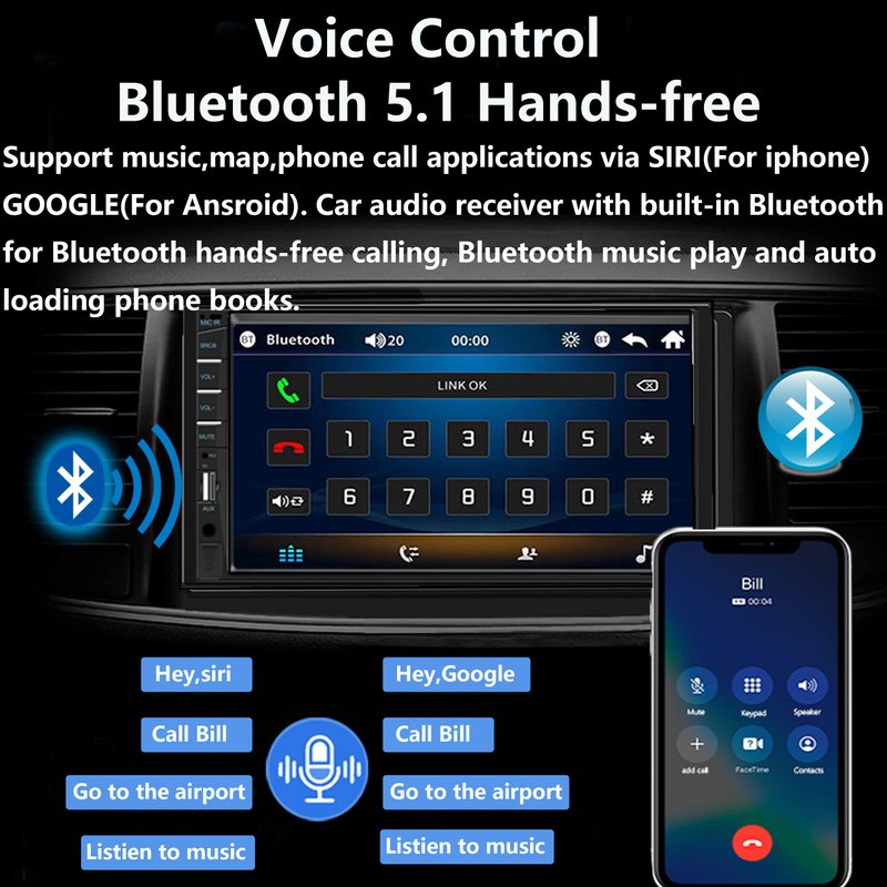 - 👍【Support Carplay & Android Auto】This car stereo double din radio support CarPlay and Android Auto which allows you to get voice control, Siri/Google assistant help you access the your phone functions including calls, map navigation, email, music, messages, etc. while you stay focused on the road. With voice Assistant, help you focus on the road and have fun along the way.