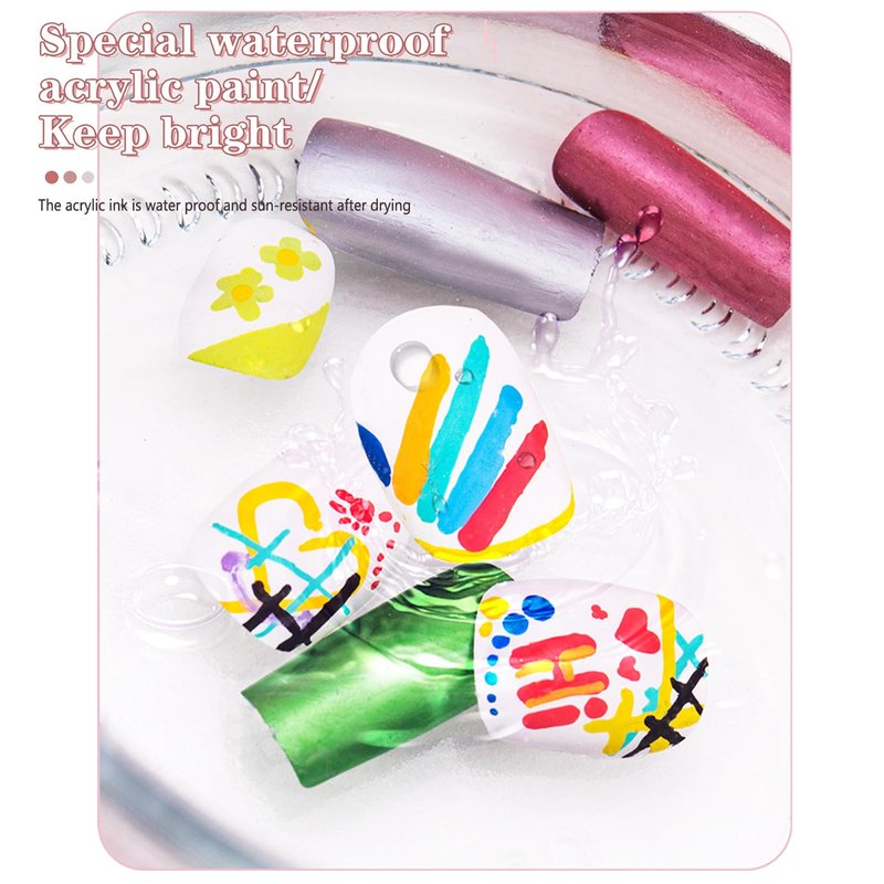 - 【DIY ANY NAIL PATTERN YOU WANT】nail art paint pens can be used to create intricate designs with ease, making it possible to achieve professional-looking nail art at home. From simple polka dots, stripes to complex designs like flowers, animals and abstract patterns, Acrylic Paint Markers set are perfect for creating stunning nail art for any occasion.