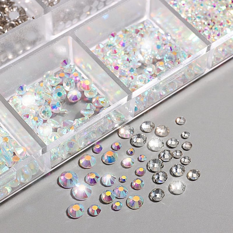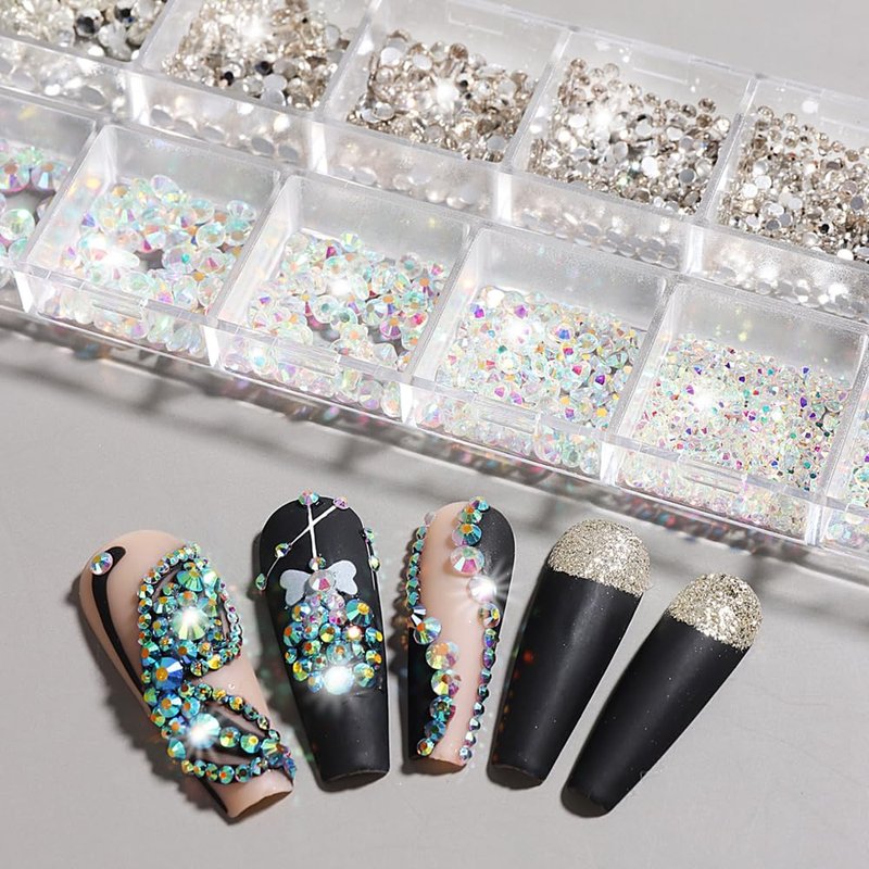 - 【High Quality Rhinestones】The charming crystal rhinestones are made of high-quality glass, featured with nice shapes and beautiful cutting facets.These gems have a delicate and exquisite shine, enhancing the appeal of your crafts or nails. The transparent AB color will have different color performances under different light or different refraction angles, providing long-lasting sparkle.