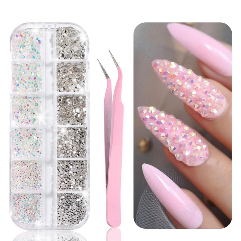 - 【You Will Get】12 grids/box nail rhinestones,contains transparent AB color and clear color(6 sizes for each color) ; 1 piece of Double head rhinestone picker and 1 piece of pink tweezer.