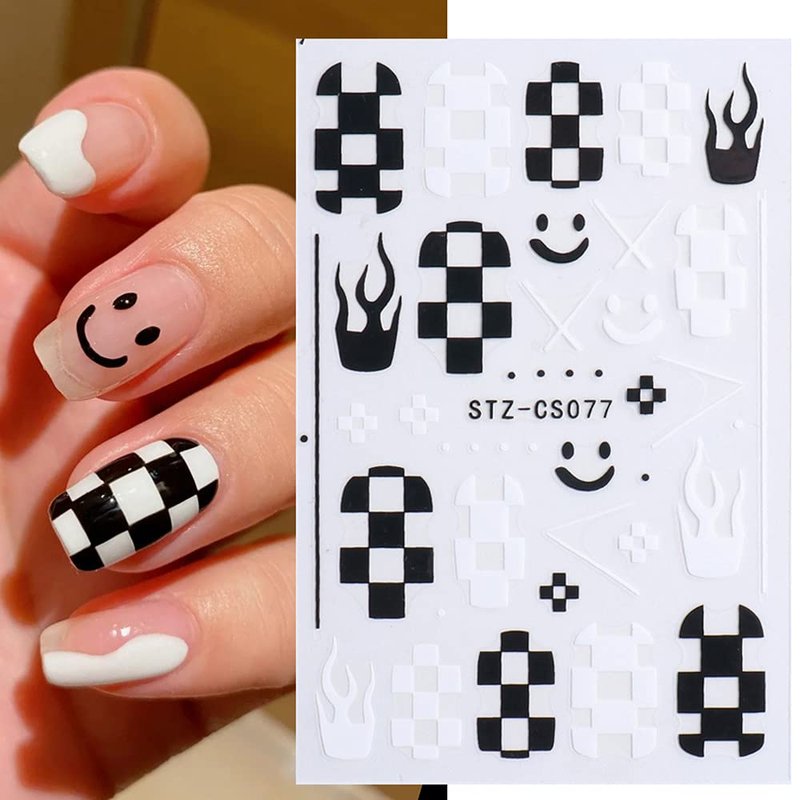 Nail Art Stickers Decals, Self Adhesive Nail Stickers Nail Art Supplies Black White Nail Designs 3D Checkerboard Flame Star Moon Smile Line Nail Stickers for Acrylic Nails Women Manicure Decorations