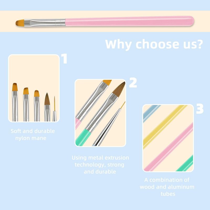 - 【High Quality Materials】This gel polish brush set is made of high-quality wood, aluminum tube, and nylon hair, which is sturdy and durable, well crafted, without shedding hair, and has cute and soft colors. This gel polish brush set comes in a variety of sizes, including different brushes and brush heads for design, and the gel polish brush set is perfect for beginners and professionals