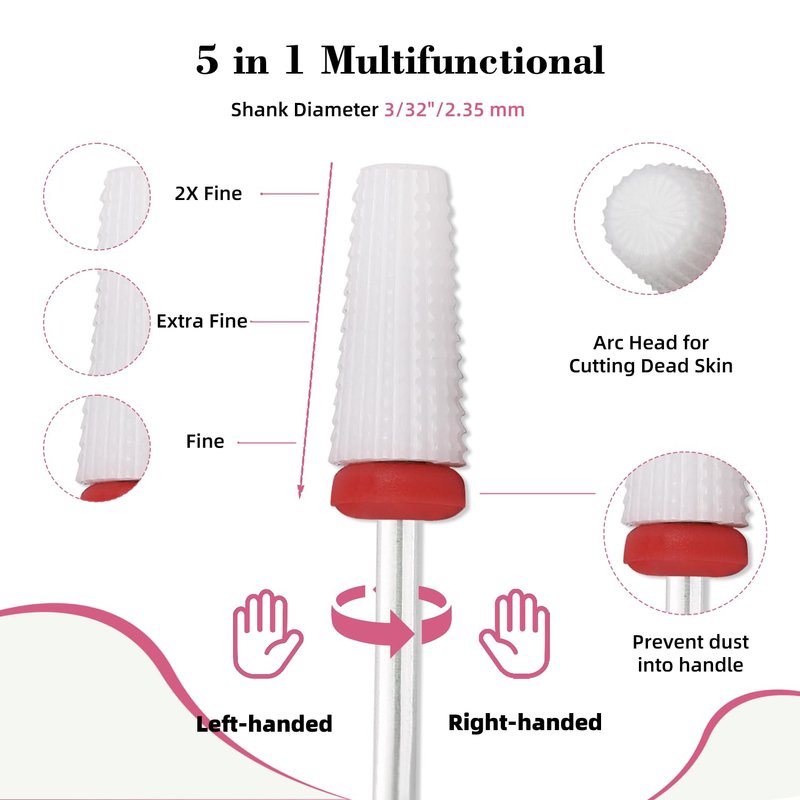Nail Ceramic 5 in 1 Bit - Two Way Rotate use for Both Left and Right Handed - Fast remove Acrylic or Hard Gel - 3/32" Shank - Manicure, Nail Art, Drill Machine (Fine, White)