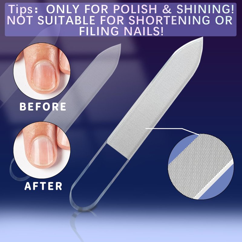 - 💎💎 POLISH NAILS GLASS FILE: You will receive a stainless steel nail clipper and glass nail file in package. The file only can polish your nails to make them smoother and flatter, but not suitable for shortening filing nails. It is made of high-density nano glass that is washable and rust-resistant.