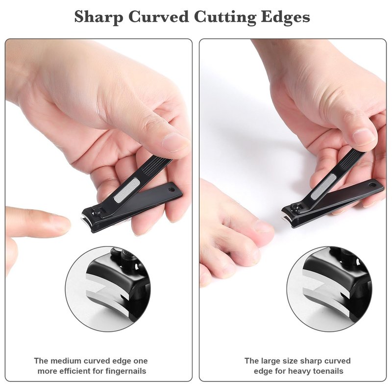 - Sharp Durable Nail Clippers Set: Our professional-grade nail clippers set include a small curved fingernail clippers and a large straight toenail clippers. High quality stainless steel material with sleek black matte design make them more attractive and durable. They are well aligned, quite sturdy, very sharp and easy to use