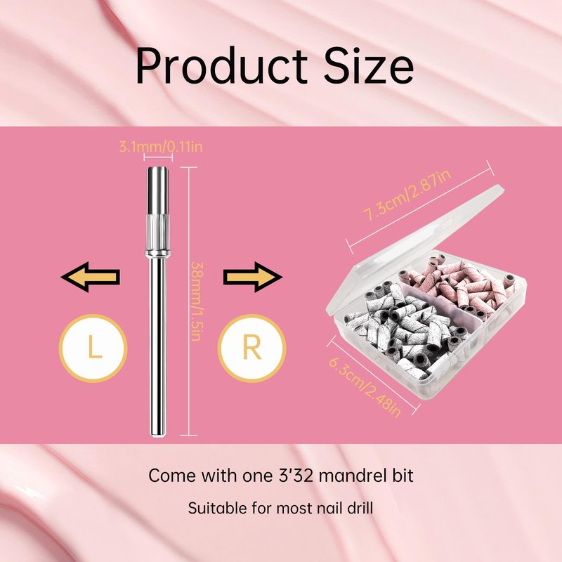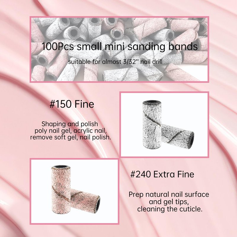 - Small Sanding Bands for Nail Drill: You will get 50pcs #150 white mini sanding bands and #240 extra fine pink small sanding bands with box and two sliver 3.1mm mandrel bits. Great nail tools for nail tech must haves.