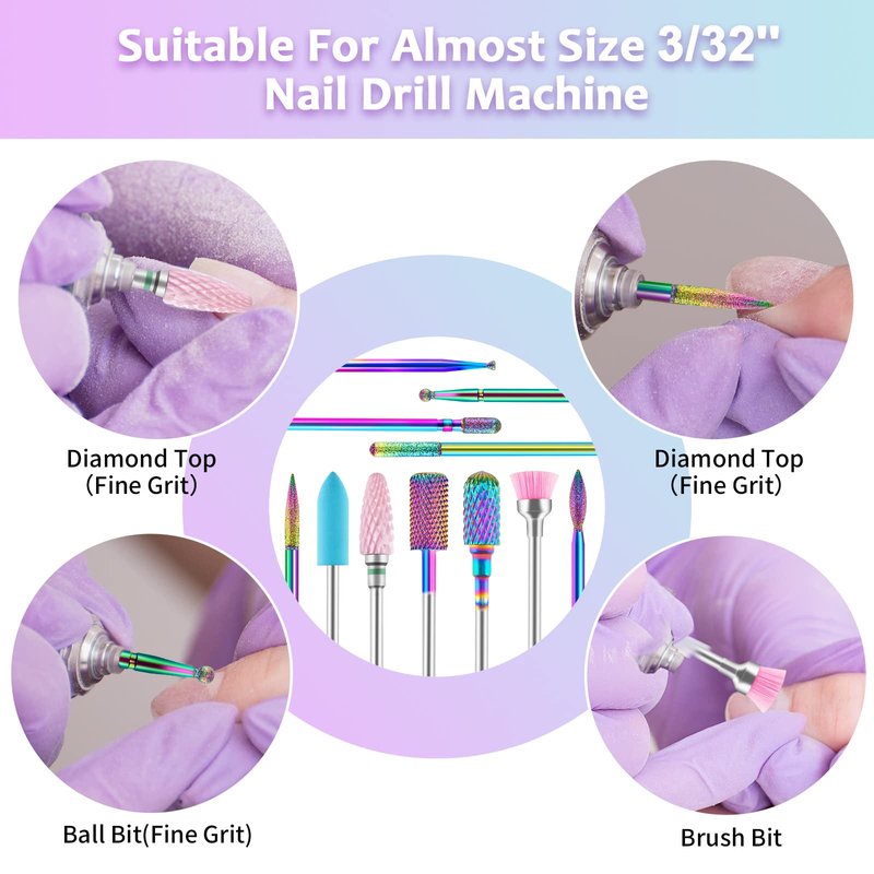 - ✨【ALL-IN-ONE SET】The HEYMKGO Nail Drill Bit Set is a comprehensive kit that includes 11 various shapes of nail drill bits. This nail bits for nail drill consists of 8 rainbow diamond carbide drill bits, 1 ceramic drill bit, 1 silicone drill bit, and 1 brush bit. It features excellent strength and sharpness, making it perfect for nail preparation, removing acrylic gel nails, polishing, cleaning the nail surface, and trimming dead skin in the cuticle area.