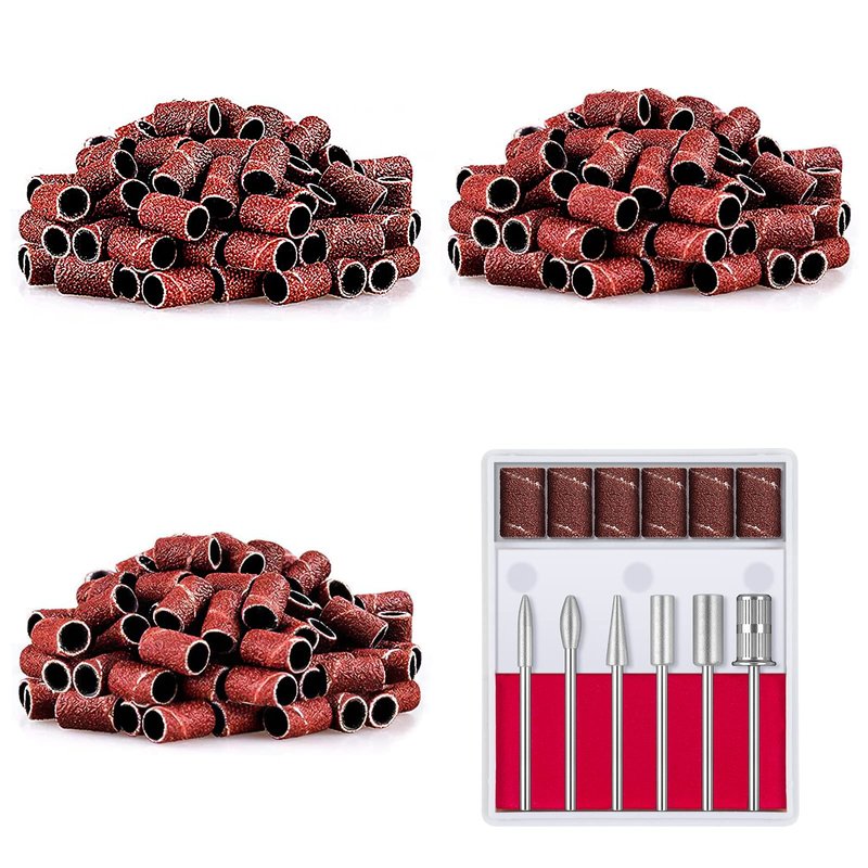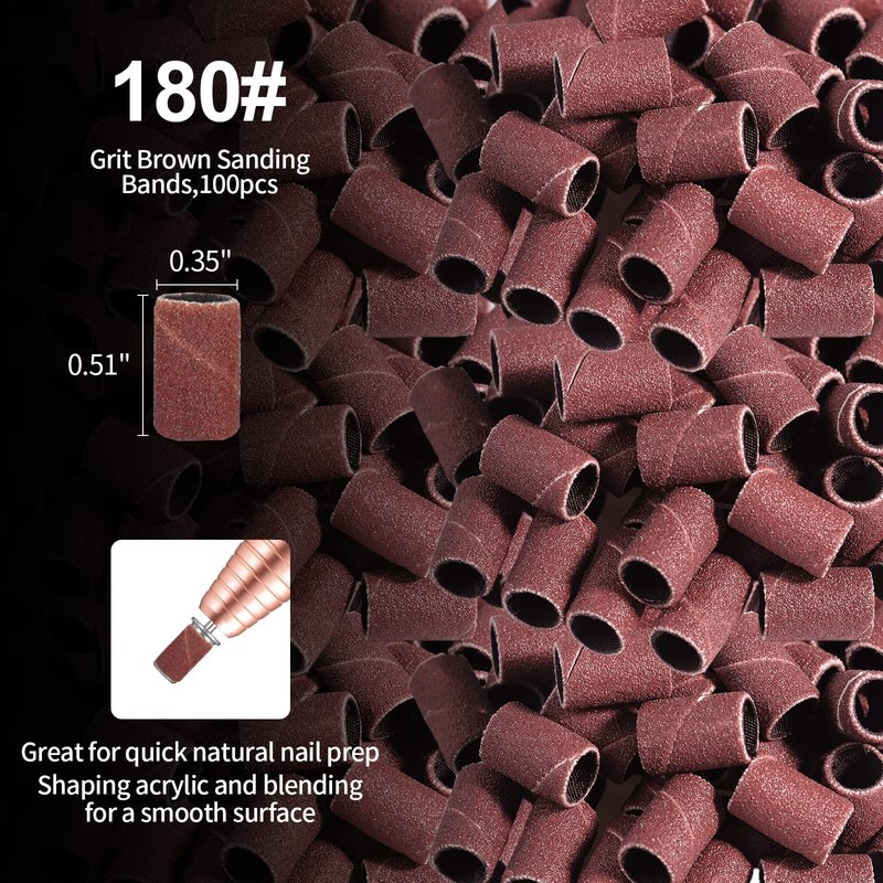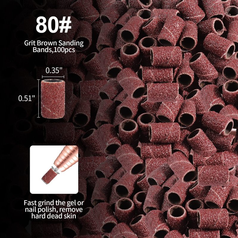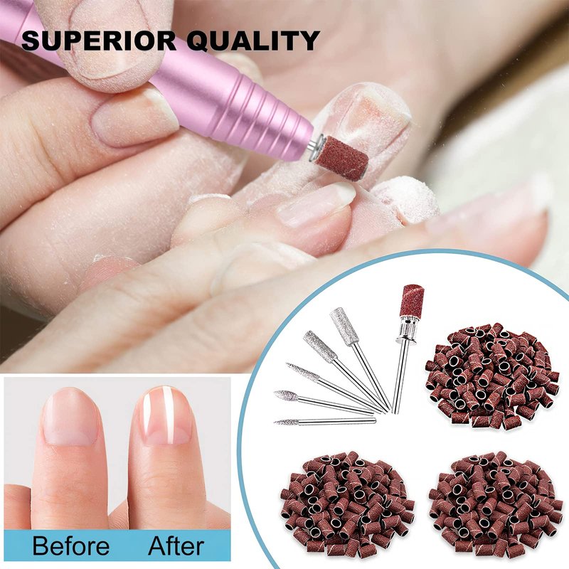 - High Quality - Great material, high hardness, durable and do not fall apart . Come with 100 pieces brown coarse grit 80#, 100 pieces zebra medium grit 120#, 100 pieces black fine grit 180# and 6pcs 3/32 inch professional nail art drill bits.