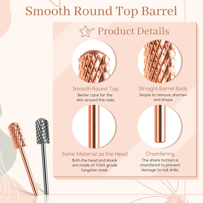 - ✅DRILL BITS FOR NAILS – You will get 2 pcs Large Barrel Smooth Top Carbide Nail Drill Bits, rose gold and space grey color. Both Coarseness are Extra Coarse. Fits universal 3/32’’(2.35mm) shank. Suitable for beginners, experienced, salon nail tech.