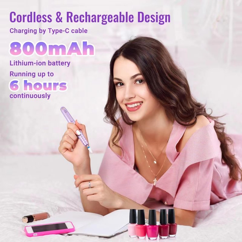 - 【USB Rechargeable】The electric nail file professional has a built-in 800mAh lithium battery. Supports USB charging, wireless use. When fully charged, it can be used for 6h. The cordless electric nail file is in pen shape with a storage bag, you can take it for anywhere.