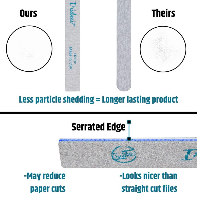 - VIRTUALLY NO PARTICLE SHEDDING. Particles that fall off a nail filer can make a mess. An acrylic nail file will be used to remove a lot of material fast and should not fall apart after one use. Iridesi uses high quality abrasive material that has minimal particle shedding. Every nail filer of this type will shed, ours just sheds less than others in our opinion. Heavy duty enough to be used as a dog nail board as well. Not satisfied with your purchase? Contact the manufacturer for quick help.