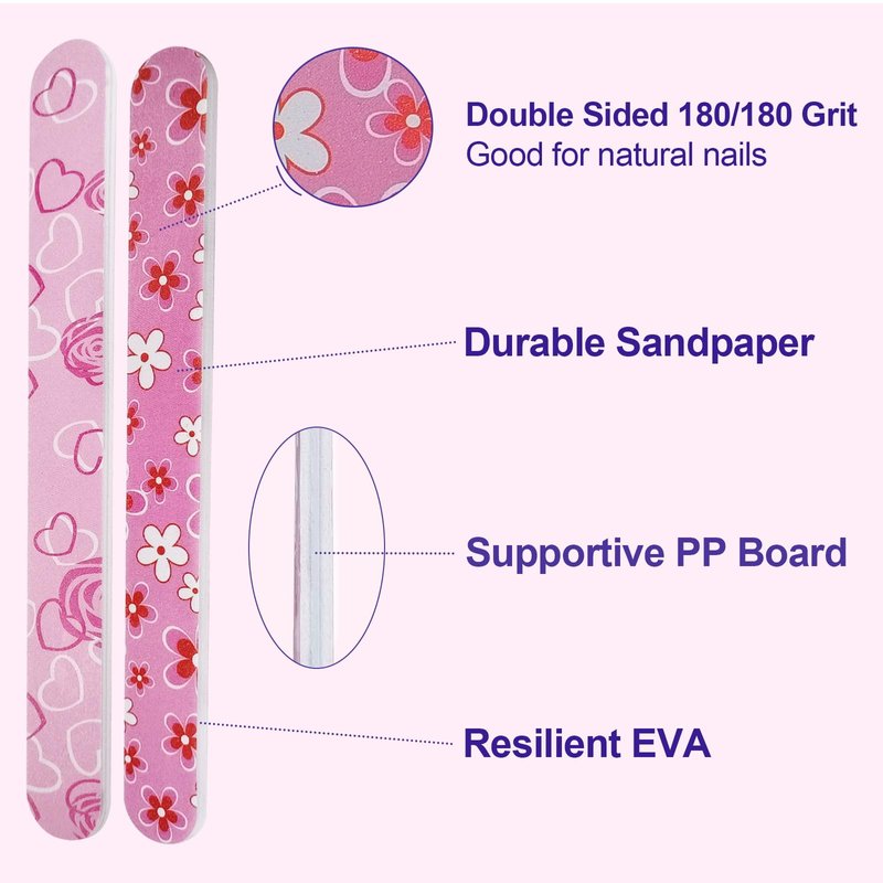 - Dual-Sided Nail Files with 100/180 Grit: Each set includes 24 double-sided nail files, featuring a coarse 100 grit texture on one side for acrylic and thick nails, and a fine 180 grit texture on the other for buffing away imperfections on the nail surface and refining natural nails, smoothing up your nail edge with refined shape.
