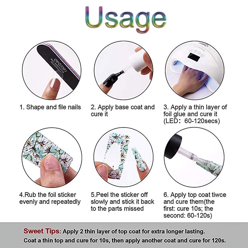 - EXTENSIVE USAGES -- the foil nail stickers are suitable for both natural nails, artificial nails, acrylic nails and more; In addition, they are also applicable to decorate your phone covers, photo frames, glasses or other DIY craft projects.