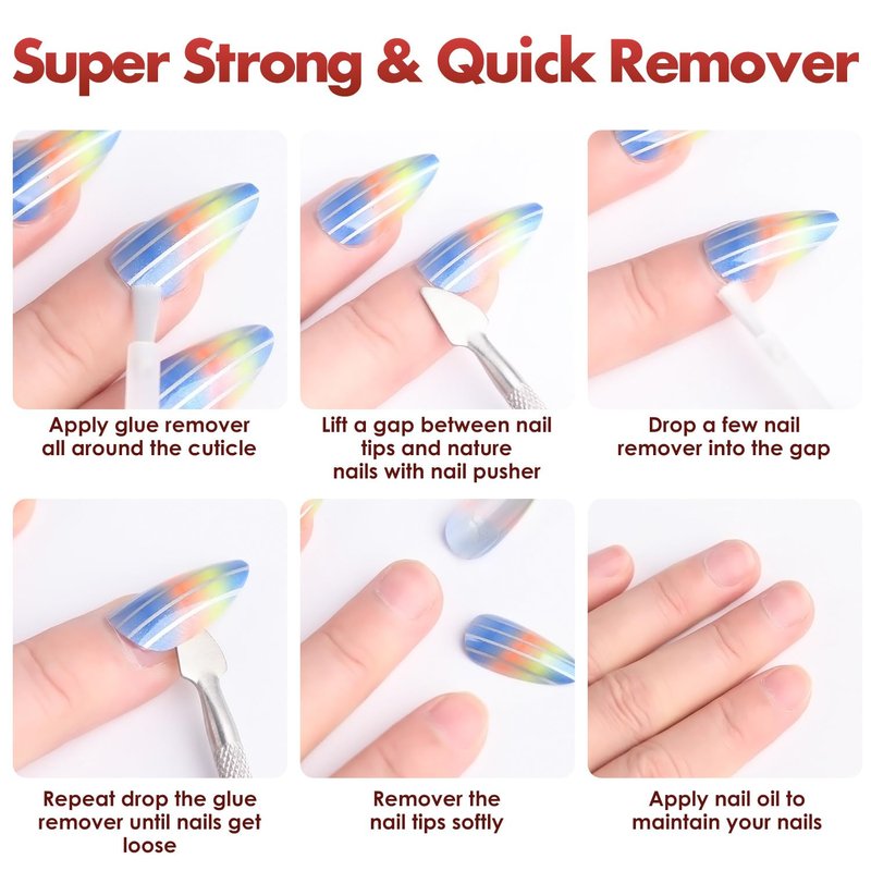 1. Apply nail glue remover around all the edges of the nails 2. Apply glue remover between nails & nail tips 3. Use nail pusher to lift a gap 4. Drop a few remover in the gap 5. Repeat dropping until the nail tips dissolve and get soft 6. Remove the false nails sightly