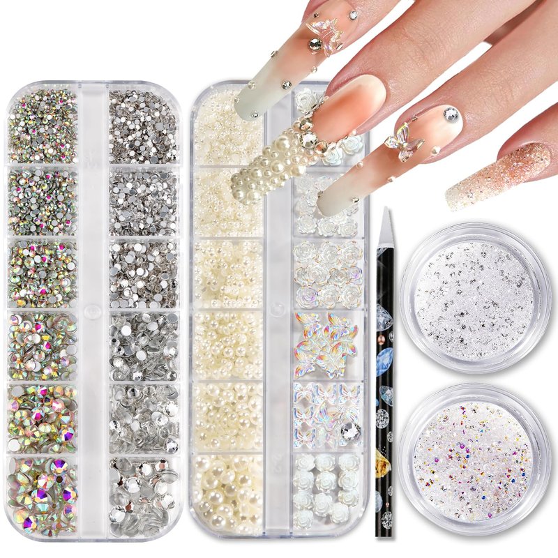 - [WORTH YOUR MONEY] At Haozher, we offer excellent value for your money. Your purchase includes: 1 box of AB and clear nail crystals rhinestones (2440 pieces); 1 box of beige half pearl nail charms (1300 pieces) and 3D butterfly+flower nail charms (60 pieces); 2 boxes of small nail gems and rhinestones in AB and clear colors (approximately 7200 pieces); 1 unsharpened adhesive wax pencil for rhinestones.