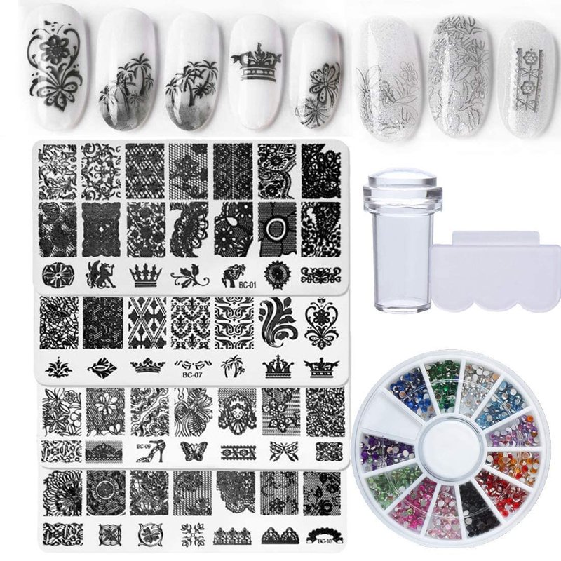 - ✨Perfect nail art stamping kit : Contains 4pcs rectangle metal nail stamping plate, 1set silicone clear stamper and scraper, 1 wheel nail rhinestone. Comes with all your needs. The stamper is very easy to use and picks up patterns quickly. The nail stamper is clear and you can easily see where to press on the nail, the image will not be distorted or blurred. They are the perfect nail stamping tool for nail professionals and beginners lover.