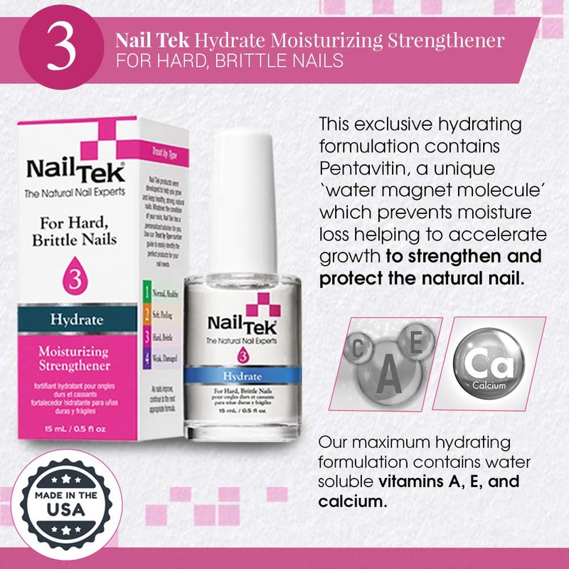 Nail Tek Hydrate 3, Moisturizing Strengthener for Hard and Brittle Nails, 0.5 oz, 1-Pack