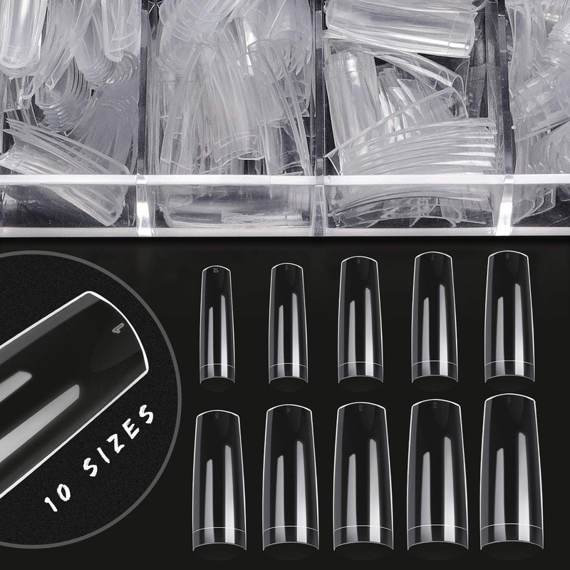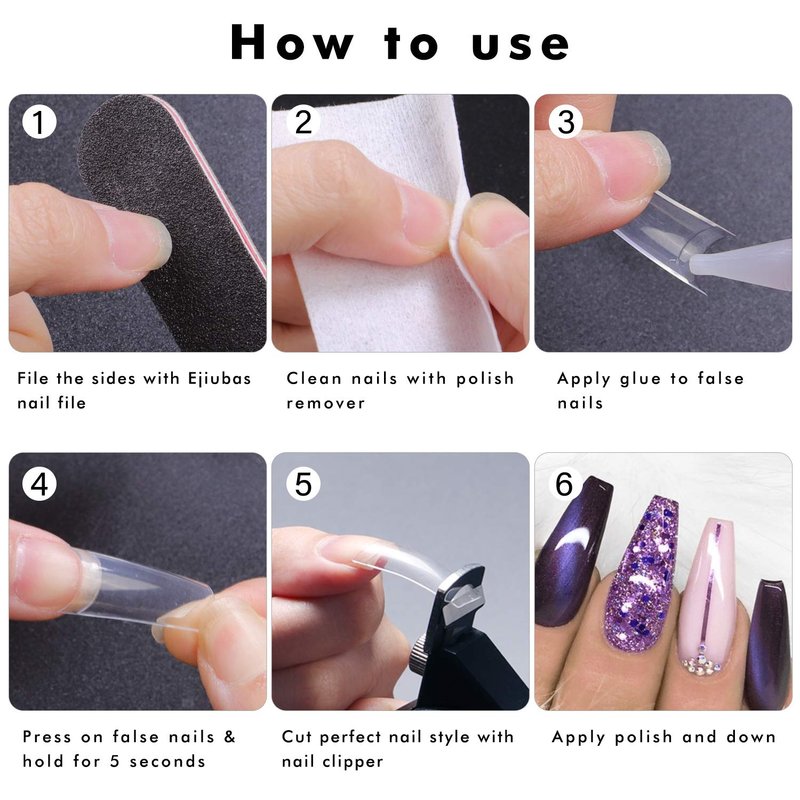 - 3 IN 1 NAIL TIPS EXTENSION KIT: Includes 500pcs clear nail tips, 4pcs 0.07oz nail glues and 1pc nail file with acrylic case, you can press on nails conveniently, no need to buy nail glues individually, especially DIY nail home, saving time and money.