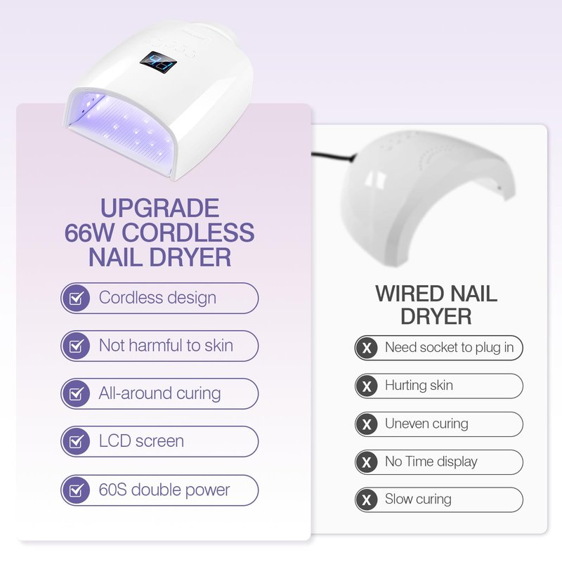 - 【Wireless Rechargeable Cordless Nail Lamp】our 66W nail dryer, equipped with 33 bulbs, delivers salon-quality illumination for gel polish, acrylic, etc. Enjoy fast curing without any risk of burns.