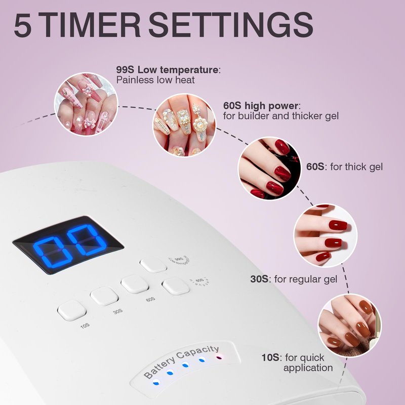- 【Smart Gel Nail Lamp】Swift 10s drying, versatile 30s/60s curing for various needs. Tailored for builders and hard gels with 60s high power and 99s low-temperature options. Lights activate on hand insertion, deactivate on removal.