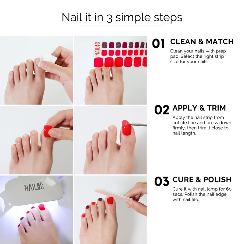 - HASSLE-FREE APPLICATION - Do not bother to apply nail polish to your toes. Our self-adhesive toe nail wraps are super easy to apply and remove. Fast and funny DIY pedicure at home even for beginners.- The semi-cured gel nail strips can last for up to 2 weeks with UV light curing.
