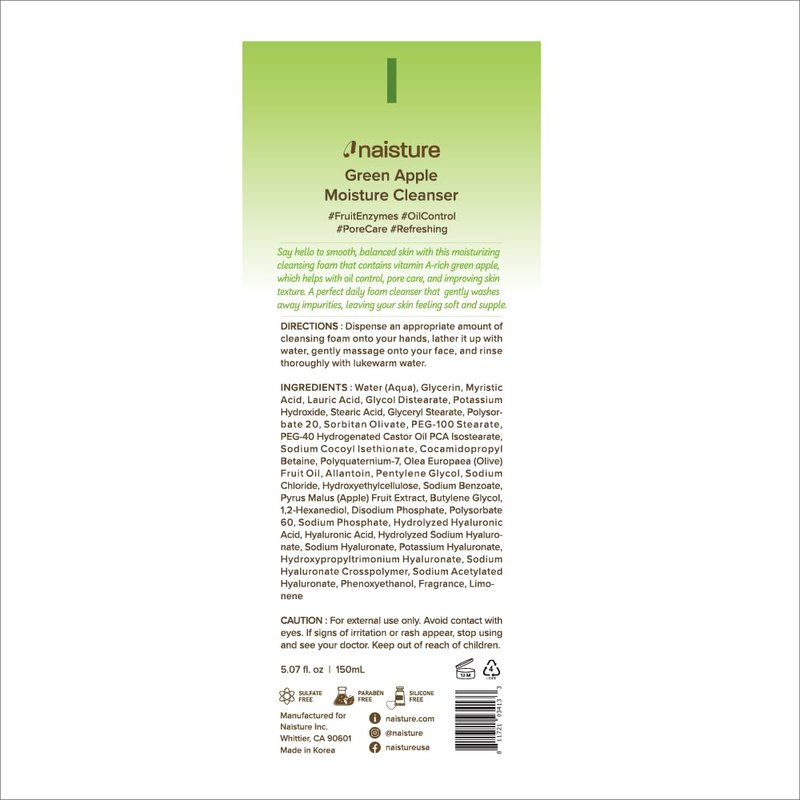 Naisture Foaming Facial Cleanser for Daily Face Wash Skincare with Hyaluronic Acid- Green Apple Moisture Cleanser