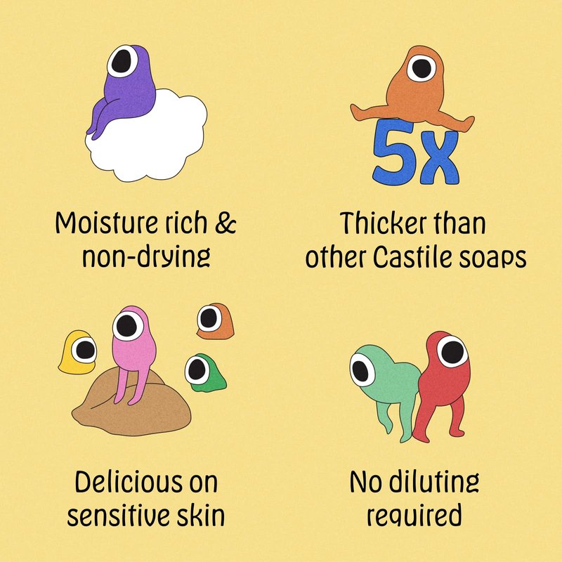 - MADE FOR YOUR SKIN - Our organic castile soap is designed for your skin. The use of organic coconut glycerin as a moisturizer makes it gentler, less drying, and less harsh than other castile soaps. Made from whole natural pure organic essential oils, our castile soap leaves no residue behind, ensuring a nourishing cleanse.