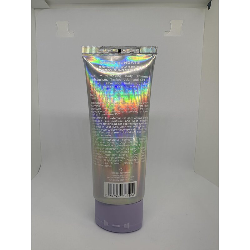 This Hydrating SPF50 Shimmery Gold Body Sunscreen is infused with Green Tea extract to multitask as your firming lotion and body hydrating cream with high performance SPF. Australian made, Bondi inspired, Fragrance free, 100% Vegan. Gives you a beautiful shimmery golden Glow with SPF50!