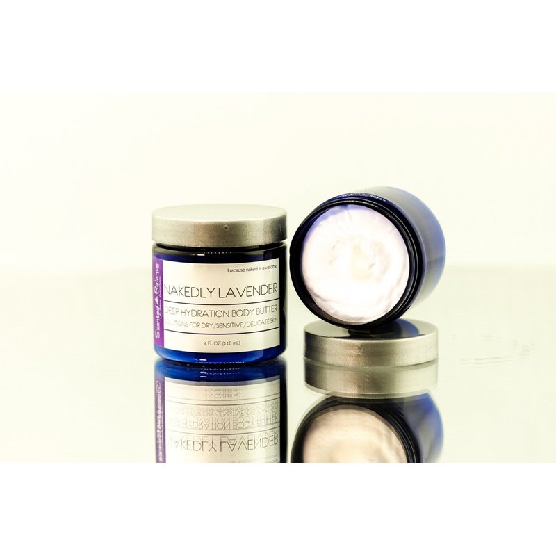 How’s your skin feeling these days? Are you dry and itchy or s-m-o-o-o-o-t-h and silky? You'll love Nakedly Lavender Whipped Body Butter – it’s a good night’s sleep in a jar. Absorbing quickly, the Nakedly Lavender Whipped Body Butter makes your skin feel so silky and moisturized. Scented with therapeutic-grade Lavender essential oil, Nakedly Lavender Whipped Body Butter is made with organic refined butters of shea, mango, sal and kokum – all proved to hydrate dry, parched skin. It is whipped to lightweight perfection to quickly nourish your skin. If you have trouble sleeping – or simply need to relax before bedtime – massage some of the Nakedly Lavender Whipped Body Butter into your feet, hands and arms. You’ll love the scent and it’s amazing how it helps to calm you and helps you sleep. If you are dealing with an eczema/psoriasis flareup or undergoing chemotherapy and radiation, this wonderful body butter is ideal to use daily for soothing and hydrating your dry, raw skin. It's so different as this particular combination of butters and oils are known to nourish dry, cracked and mature skin. There are absolutely no chemicals in the Nakedly Lavender Whipped Body Butter to interfere with any treatment your doctor prescribes. Many customers tell me that this handcrafted body butter was the only thing they could use during their radiation treatments. A little goes a lo-o-n-g way. This generous 4 ounce jar will last anywhere from 1 to 6 months depending on how crazy you get using it. Please note that products do not include preservatives or emulsifiers so if you are ordering in the summer, body butters soften while in transit. Simply refrigerate for about 30 minutes until it firms back up. The melting of the product does not change it’s effectiveness. Once you try this amazing whipped body butter, you’ll never go back to anything else! Please use within one year of purchase. Please note: NOT available for shipping from May – September.