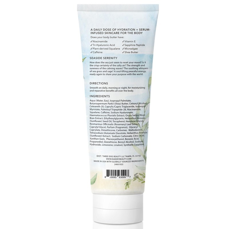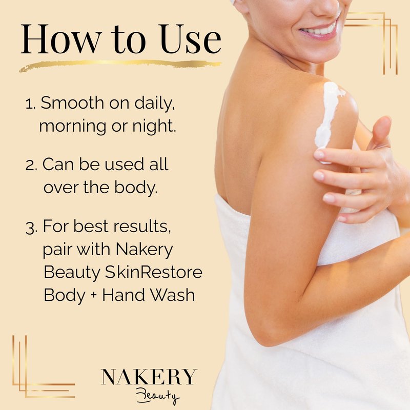 Nakery Beauty’s Serum-Infused Moisturizing Cream is designed to smooth, tighten, & firm your skin from neck to toe instantly. This skin moisturizer & firming cream visibly reduces the appearance of crepey & loose, sagging skin, both temporarily & with continued use, giving you healthier, younger-looking skin! This firming lotion & skin tightening body butter plumps the look of skin & visibly reduces the look of fine lines & wrinkles, both temporarily & with continued use. Our firming face cream & anti aging body lotion also deeply hydrates & replenishes nourishing moisture for softer, smoother, & more radiant skin. Our pure shea butter neck tightening cream also helps even skin tone while improving texture & skin’s overall appearance. This skin firming lotion & skin tightening cream help lock in skin's moisture barrier to preserve skin's youthfulness & improve skin’s overall hydration levels. Key Ingredients: Sapphire-Infused Triple Peptide. Known as the MVP of peptides that helps to penetrate skin deeper, deliver results faster, and fights crepey/loose skin. Niacinamide. A form of vitamin B-3, an essential nutrient and skincare multi-tasker! Improves skin tone + dark spots, boosts hydration and lessens skin irritations Tri-Hyaluronic Acid. A combination of high, medium, & low molecular weights of hyaluronic acid and water, helps lock in skin's moisture barrier to preserve skin's youthfulness and hydration. Micro Algae. Purest form of red algae from the volcanic island of Iceland, works to smooth out rough skin texture + rejuvenate skin on a cellular level. Caffeine. Rich in antioxidants, energizes, plumps up + wakes up the body decreases the skin-aging, harmful effects of free radicals created by environmental pollutants and UV radiation. Plant-Derived Squalane. Helps moisturize the skin, diminishes fine lines & wrinkles, and encourage cell turnover Shea Butter.