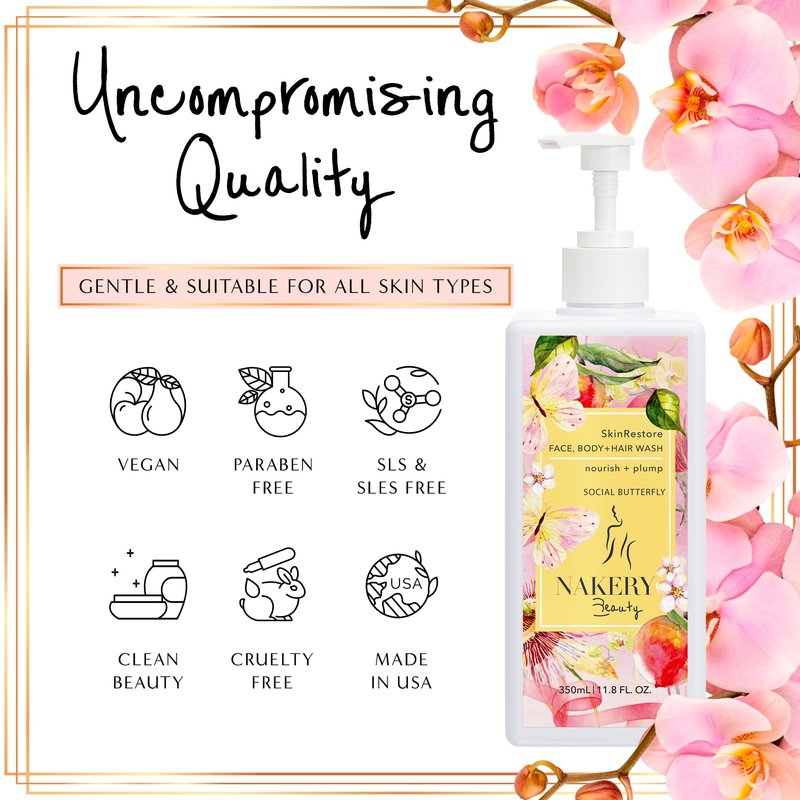 Nakery SkinRestore Hydrating Face & Body Wash with Hyaluronic Acid - Body Wash for Sensitive Skin - Foaming Face Wash & Oil Cleanser for Women 350ml - Sulfate Free & Cruelty Free - Social Butterfly